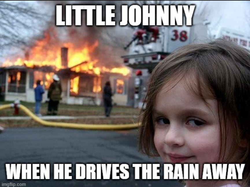 This attitude is probably why we’re dealing with climate change now. How about teaching Johnny to enjoy the rain instead? Jump in some puddles, Johnny! Build immunity. Learn about the water cycle? And if you’re going to be a Johnny, aim higher—like Johnny Sins Depp—versatile and open to anything.